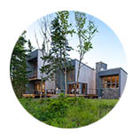 THREE LANTERNS ON THE ATLANTIC northern maine Located near the most northern historic port in the United States adjacent to Nova Scotia, this residence is on a finger bay leading to the Atlantic Ocean. Inspired by the enigmatic bedrock along the rock-bound coast, the house is comprised of a series of spatial zones each containing a singular domestic activity or use (living, study, sleeping, log and food storage and parking). Each volume is expressed on the waterside as a light filled aperture connecting each space to the view. Each volume offsets to the diagonal view to allow each zone to acknowledge the ocean view. The home is made of clearly detailed natural materials integrating the home with its natural setting and allowing it to age naturally. |